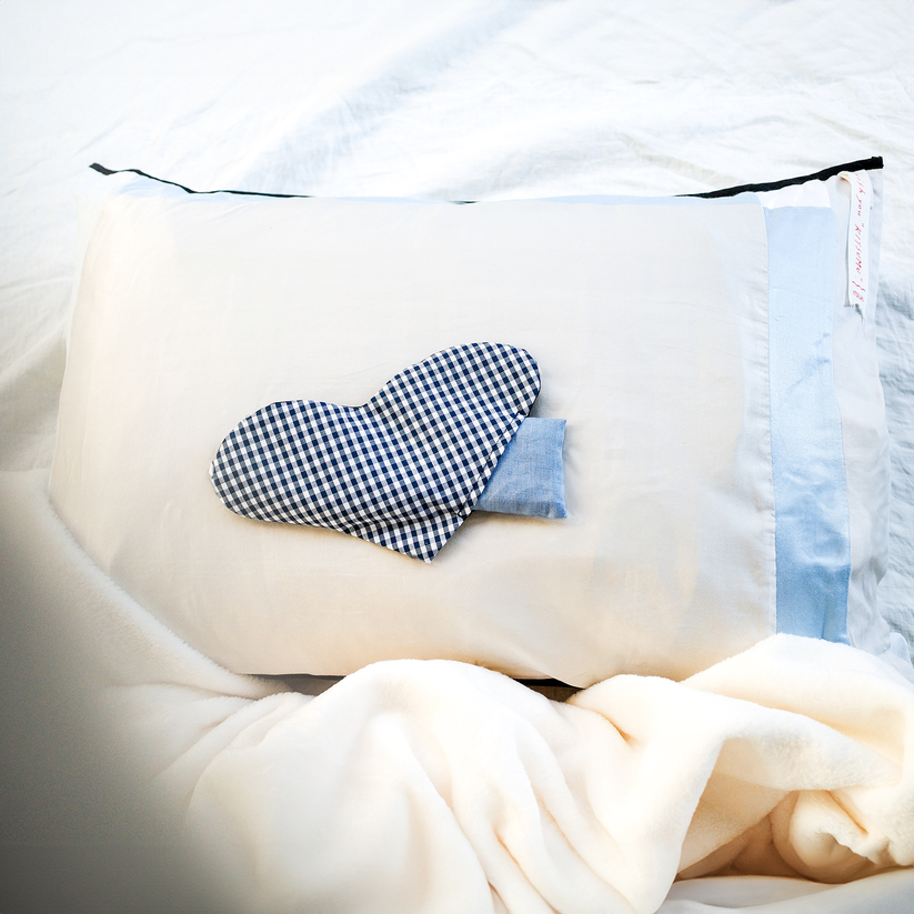 △INOME:ブラックギンガムネイビー ¥2,500 小豆入りの内袋をレンジであたためて使うホットアイマスク。本体肌面はシルク100%、表面はコットン100%