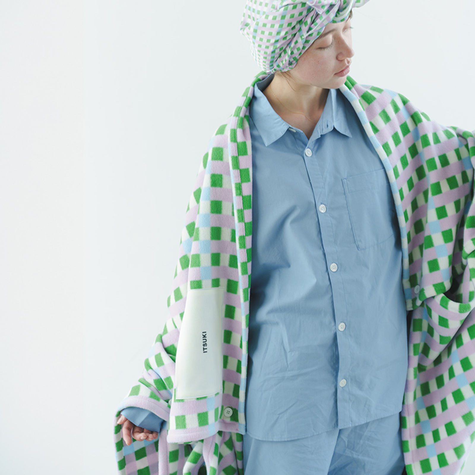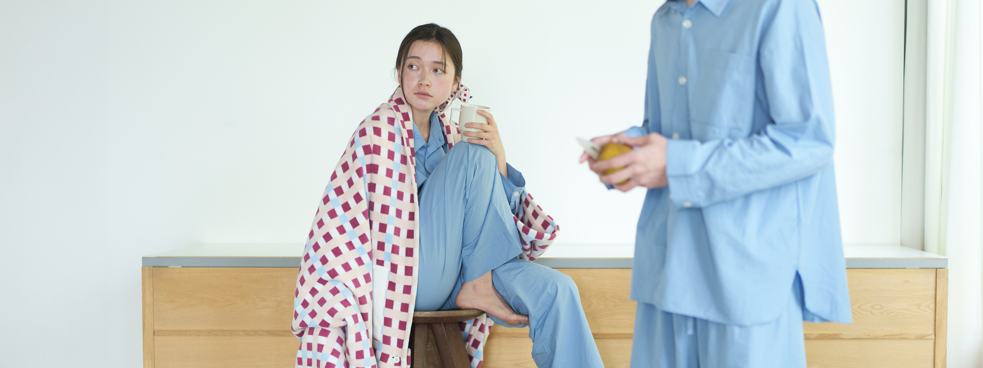 サイドのボタンを閉じればガウンに。あたたかさのうつったブランケットを羽織ってベッドから出て、くるまったまま過ごす。そんな夢のような朝を過ごせます。