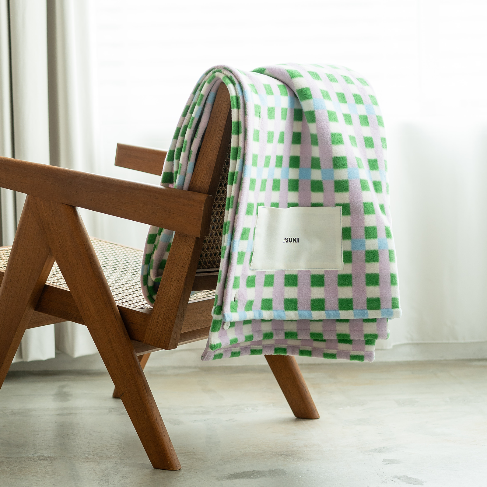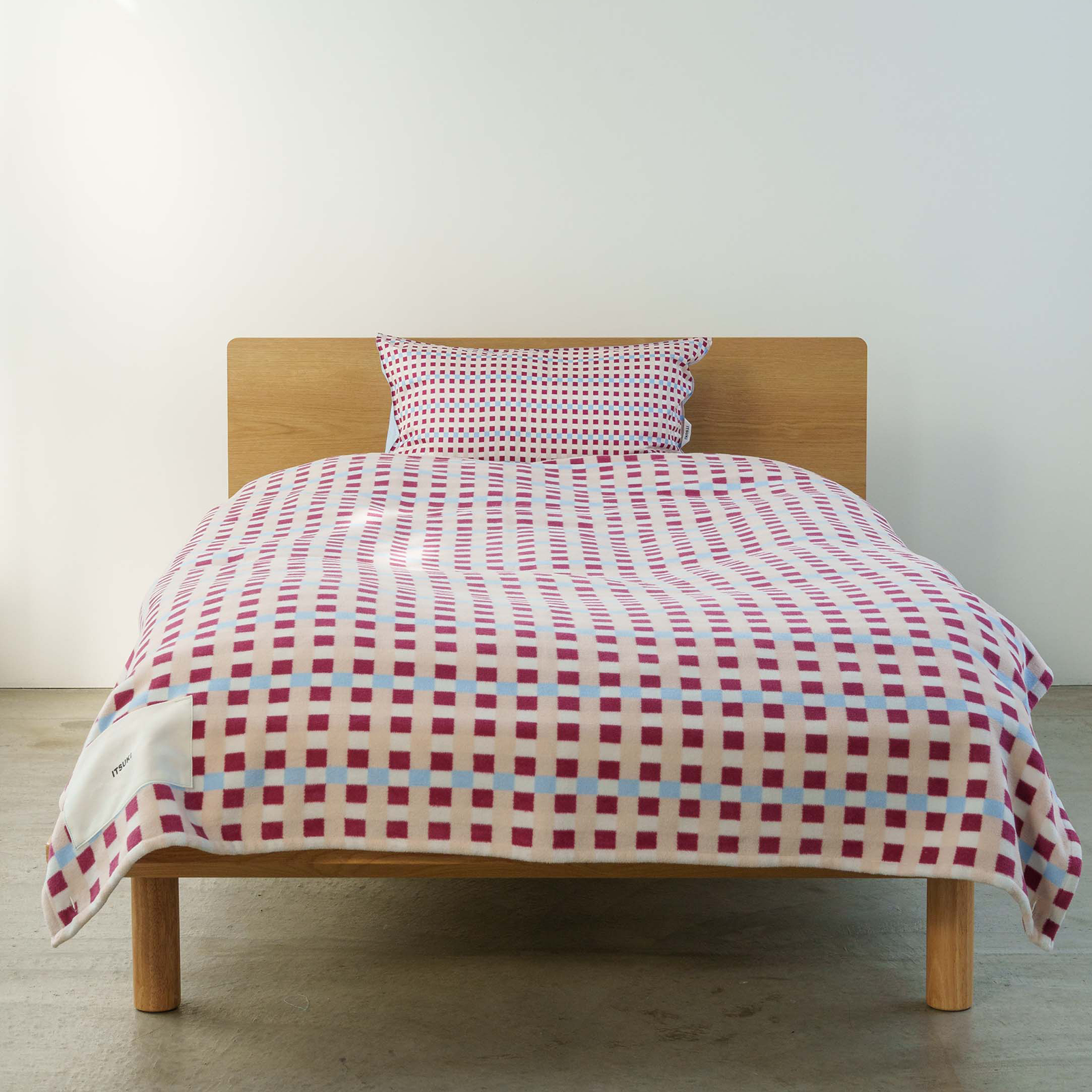 ジャガード織の生地を起毛させた優しい手触りのコットンブランケットは、日本で長く続く工場で生産。