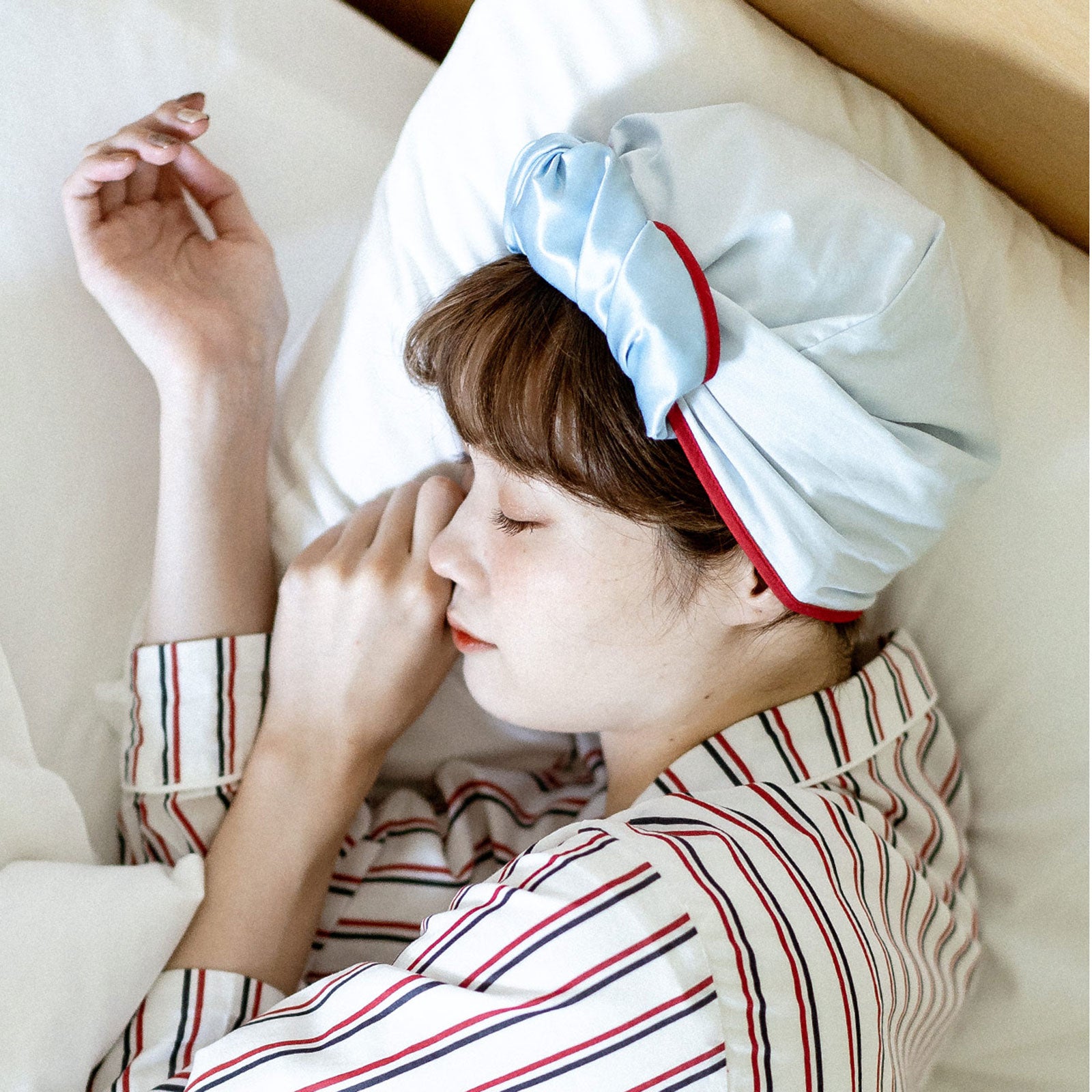おやすみ中につけることで、摩擦や静電気、寝癖を防止して髪のダメージを抑えるナイトキャップ。
