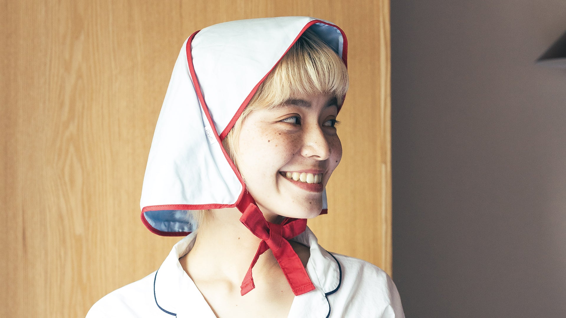 肩までの長さの髪なら気軽にかぶれて、アゴで紐を結ぶので脱げにくく快適です。